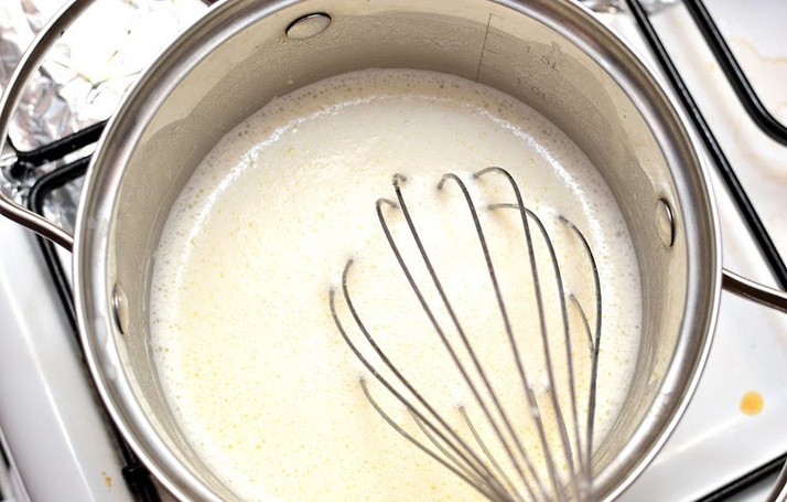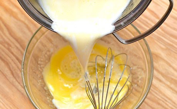 4. Tuang krim tersebut ke dalam kuning telur dan lanjutkan mengocok kuning telurnya setelah melakukan ini. Hal ini akan memanaskan kuning telurnya tanpa memasaknya.