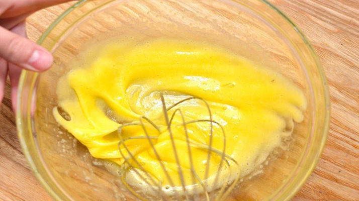 3. Kocok kurang lebih 1 menit hingga 4 kuning telur tersebut terlihat pucat.